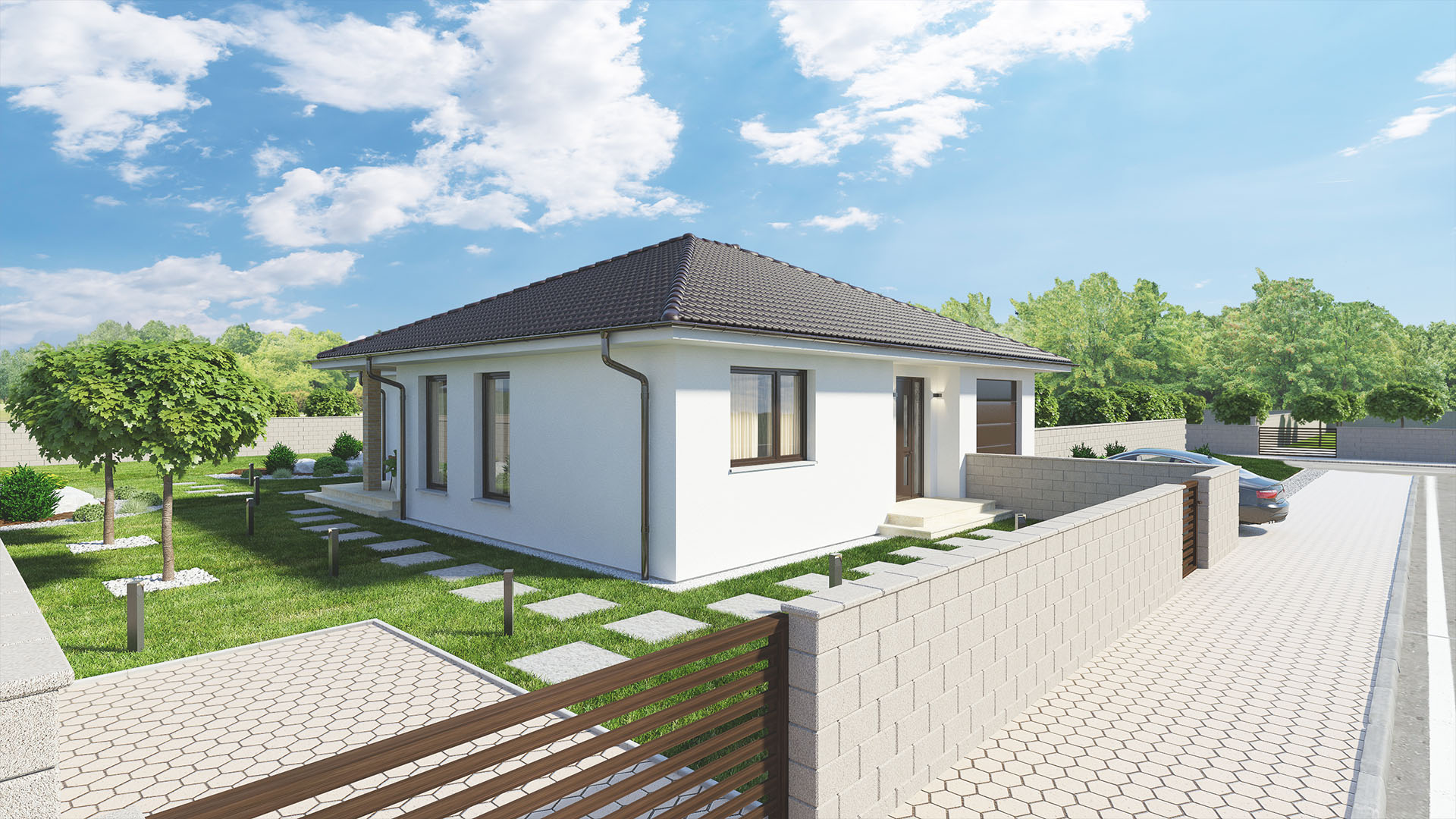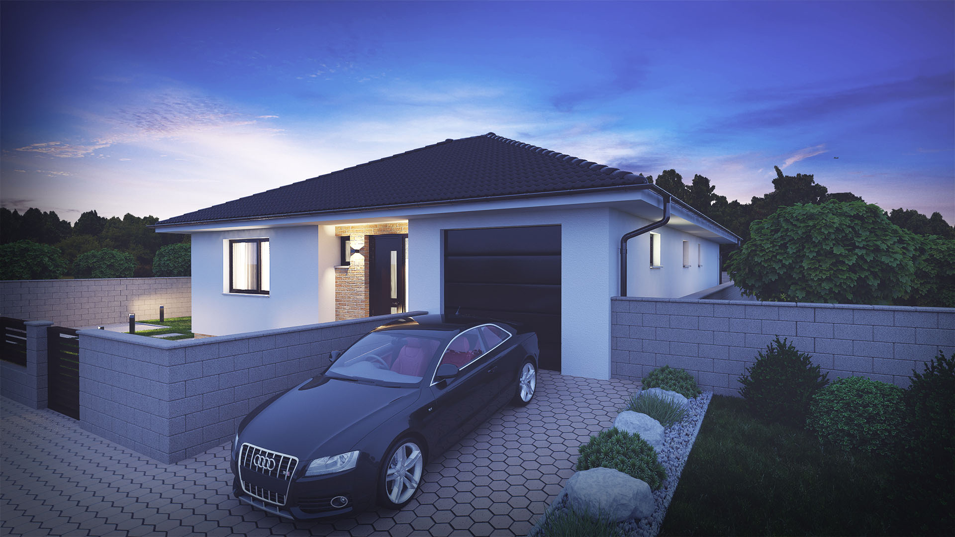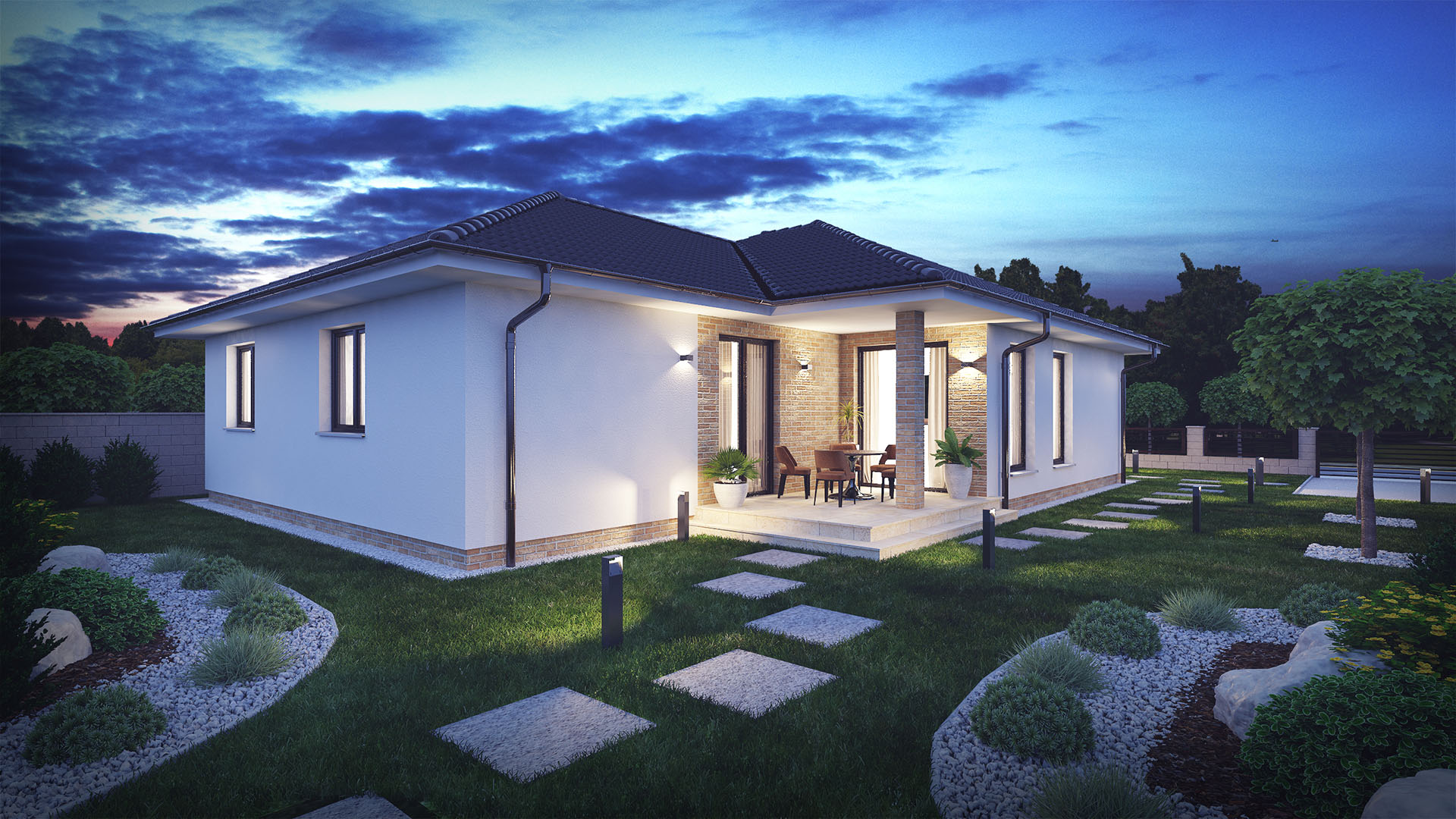 - veľko - formátové zámkové dlažby, prístupové časti, chodníky a terasa